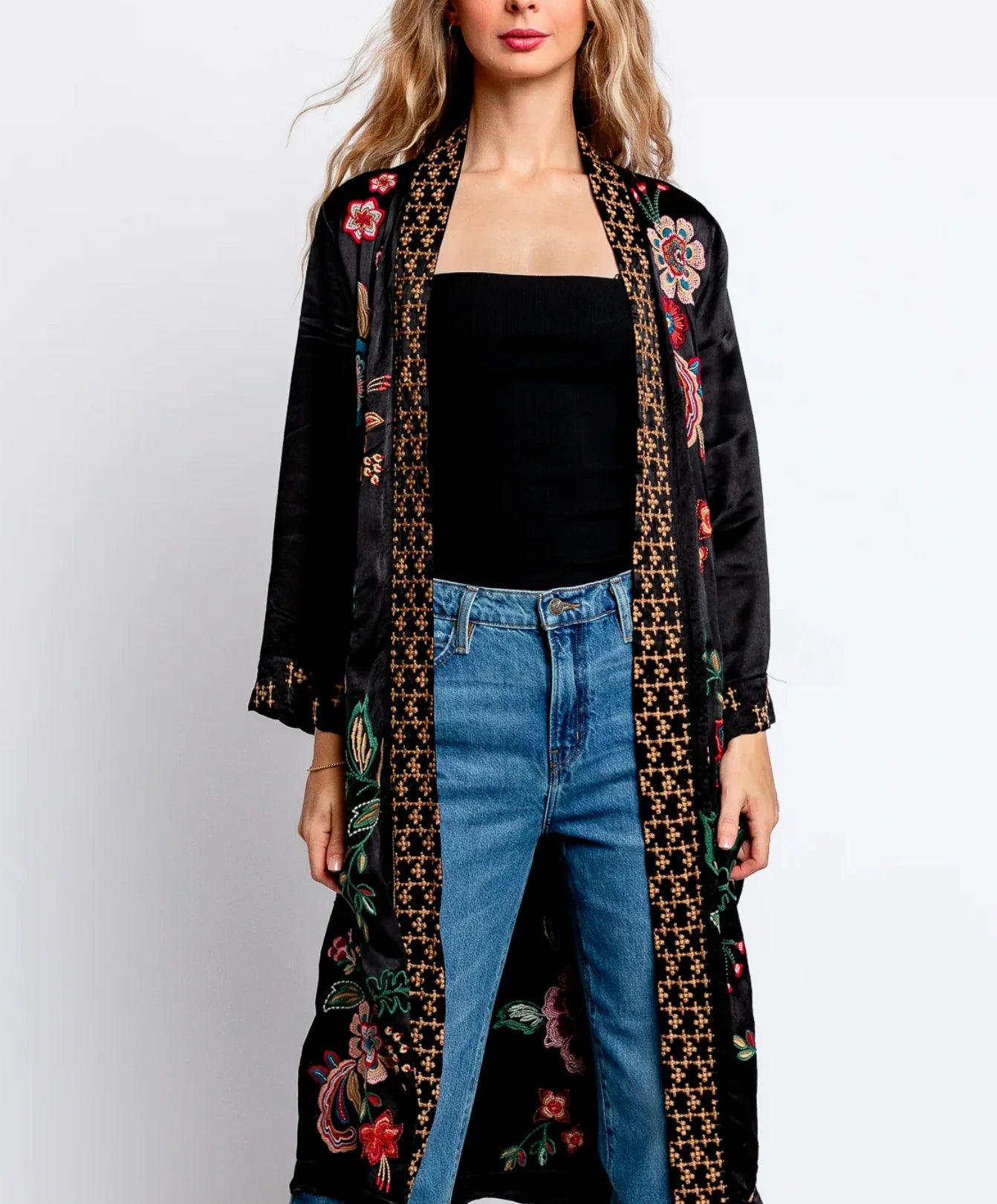 Enhanced with ornate embroidered detailing and bold florals, the Long Kimono Coat adds a hint of drama to your style. Crafted from a rich silk...